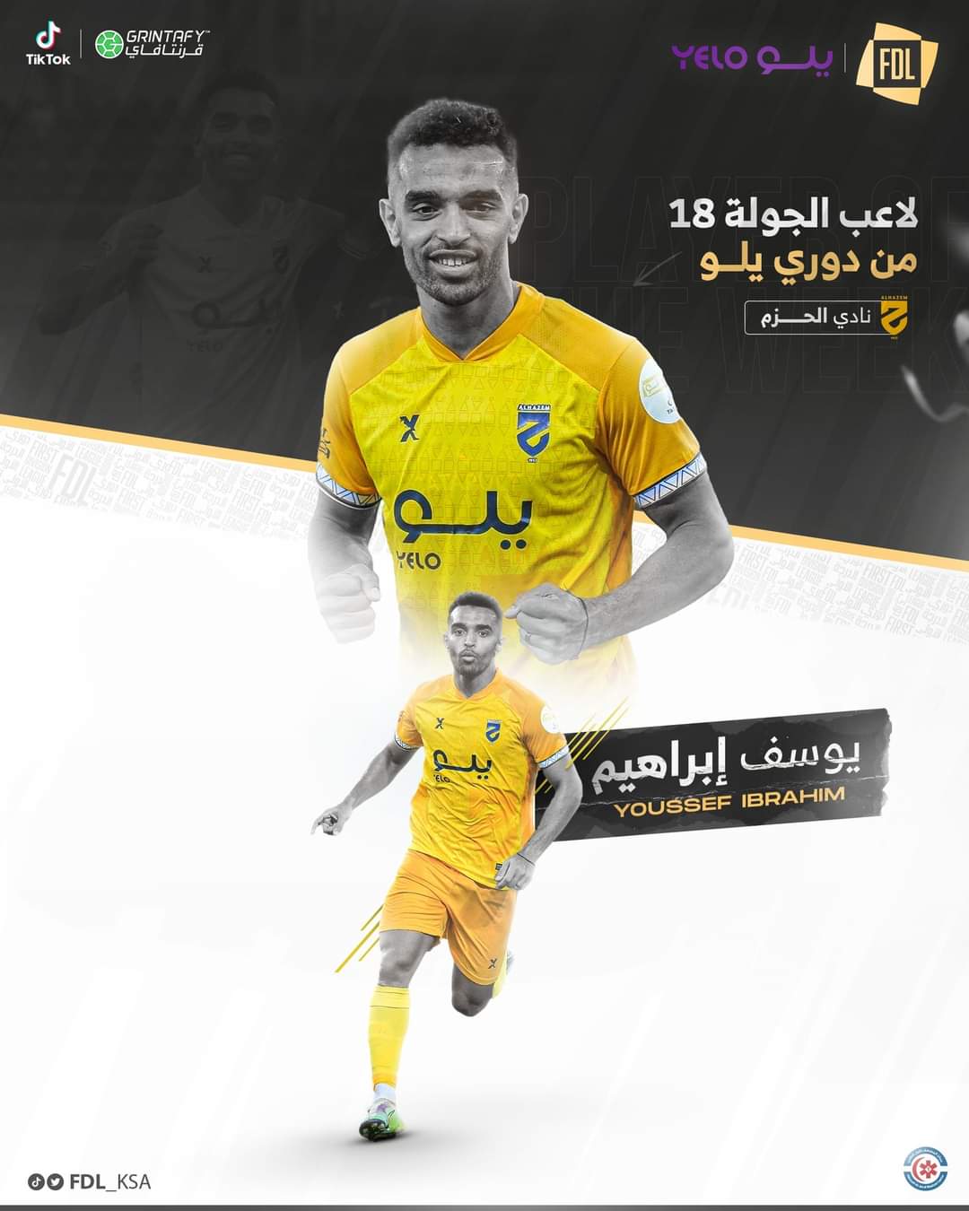 حصد الدولي المصري يوسف أوباما لاعب الفريق الكروي الأول بنادي الحزم الرياضي، على جائزة لاعب الجولة الثامنة عشر من عمر دوري يلو السعودي بعد تألقه في أول ظهور له مع الفريق.