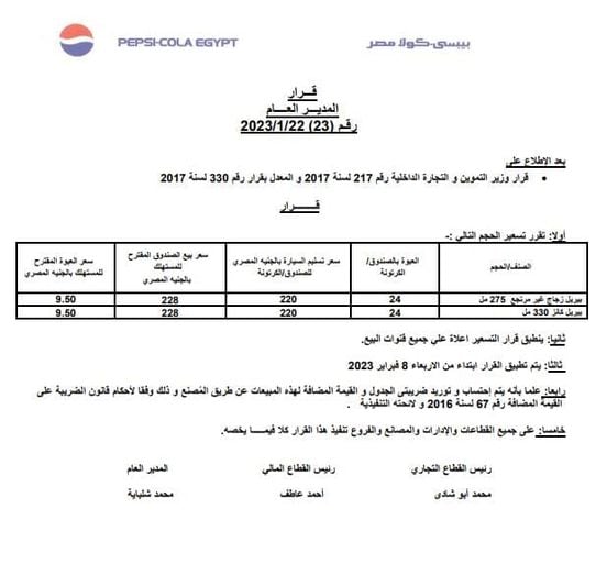 وبحسب المستند من شركة بيبسي، ارتفع سعر زجاجة بيريل زجاج غير مرتجع، سعة 275 ملي إلى 9.5 جنيه بدلًا من 8 جنيهات، بداية من 8 فبراير المقبل.
