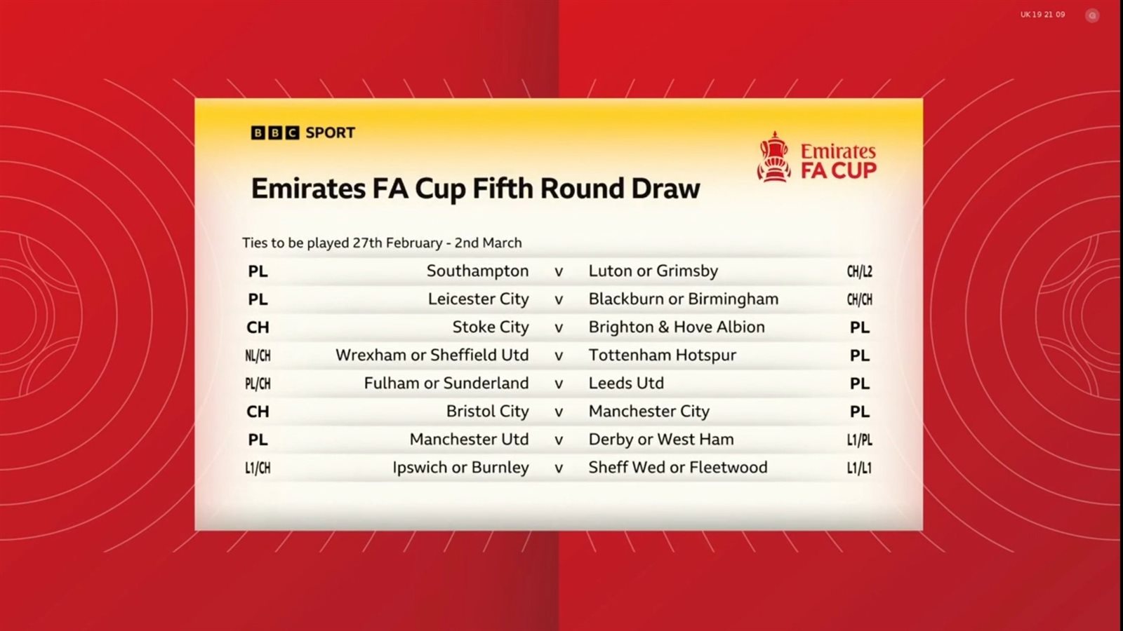 وجاءت نتائج قرعة الدور الخامس من بطولة كأس الاتحاد الإنجليزي كالتالي: