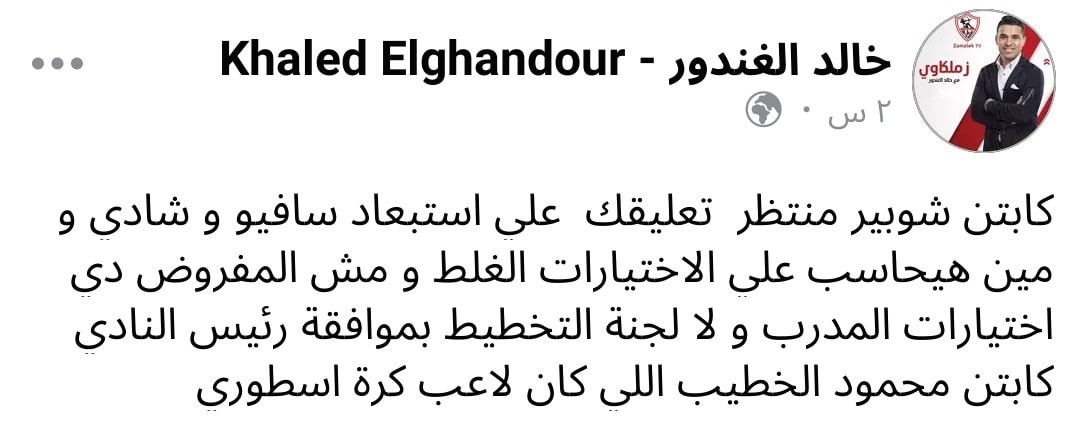 ونشرخالد الغندور عبر صفحته الرسمية على موقع التواصل الإجتماعي "فيس بوك"، معلقاً: "كابتن شوبير منتظر تعليقك علي استبعاد سافيو و شادي و مين هيحاسب علي الاختيارات الغلط و مش المفروض دي اختيارات المدرب و لا لجنة التخطيط بموافقة رئيس النادي كابتن محمود الخطيب اللي كان لاعب كرة اسطوري".