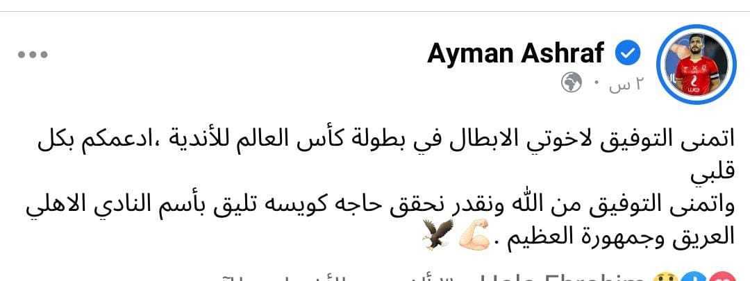ونشر بعد ذلك مدافع الأحمر أيمن أشرف عبر حسابه على مواقع التواصل الإجتماعي "فيس بوك" قائلاً : "اتمنى التوفيق لاخواتي الأبطال في بطولة كأس العالم للأندية، ادعمكم بكل قلبي".