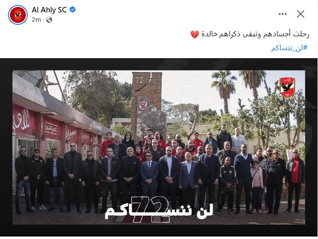 واستذكر النادي الأهلي عبر حسابه الرسمي، علي موقع التواصل الإجتماعي فيسبوك، بنشر صورة معلقاً: "رحلت أجسادهم وتبقى ذكراهم خالدة".