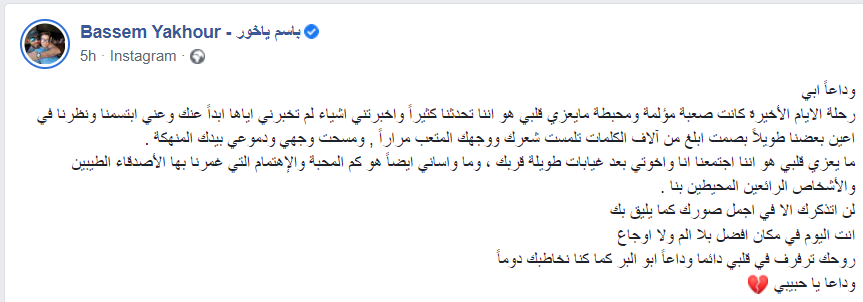 وكتب باسم ياخور: " "وداعا أبي.. رحلة الأيام الأخيرة كانت صعبة مؤلمة ومحبطة ما يعزي قلبي هو أننا تحدثنا كثيرا وأخبرتني أشياء لم تخبرني إياها ابدا عنك وعني ابتسمنا ونظرنا في أعين بعضنا طويلاً بصمت أبلغ من آلاف الكلمات تلمست شعرك ووجهك المتعب مراراً، ومسحت وجهي ودموعي بيدك المنهكة".