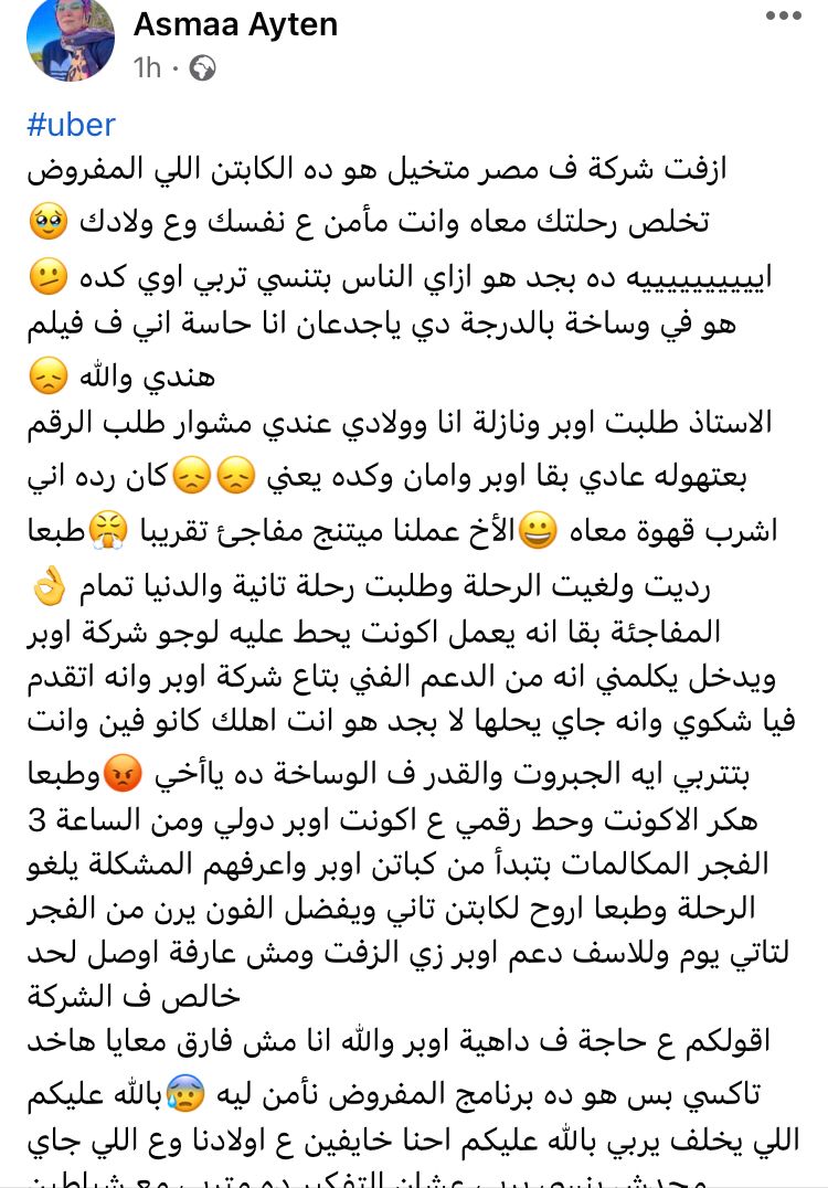 وتابعت "اقولكم ع حاجة في داهية أوبر والله انا مش فارق معايا هاخد تاكسي بس هو ده برنامج المفروض نأمن ليه بالله عليكم اللي يخلف يربي بالله عليكم احنا خايفين ع اولادنا وع اللي جاي محدش ينسي يربي عشان التفكير ده متربي مع شياطين لابعد الحدود واللي جاي اوسخ ربنا يسترها علينا وع ولادنا وع كل حد بيتعب عشان يربي وف الاخر بلاش اوبر بلاش uber مفيش امان نهائي ربنا يرحمنا برحمته".