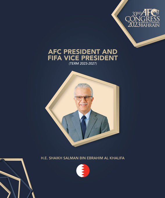 أعيد انتخاب البحريني الشيخ سلمان بن إبراهيم آل خليفة اليوم الأربعاء، رئيسًا للاتحاد الآسيوي لكرة القدم بالتزكية لولاية ثالثة حتى عام 2027، خلال الجمعية العمومية الثالثة والثلاثين التي تستضيفها المنامة العاصمة البحرينية.