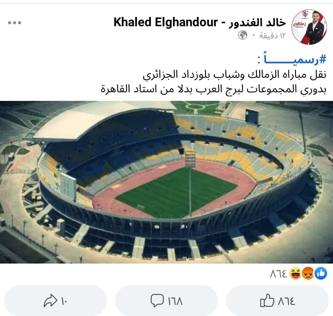 ويحتضن استاد برج العرب مباراة الزمالك وشباب بلوزداد الجزائري بدلاً من استاد القاهرة الدولي وذلك في إطار منافسات مسابقة دوري أبطال إفريقيا .