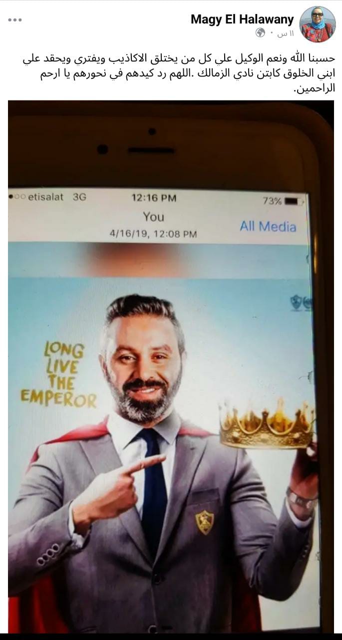 وقالت ماجي الحلواني عبر حسابها الشخصي على مواقع التواصل الإجتماعي "فيسبوك" قائلاً: "حسبنا الله ونعم الوكيل على كل من يختلق الأكاذيب على ويفتري ويحقد على ابني الخلوق كابتن نادي الزمالك، اللهم رد كيدهم في نحورهم يا ارحم الراحمين".