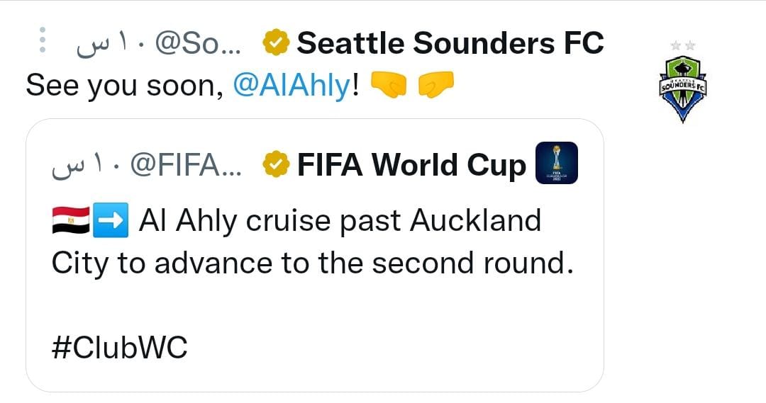 سياتل ساوندرز الأمريكي يوجه رسالة خاصة للأهلي عقب تأهلة لربع نهائي مونديال الأندية