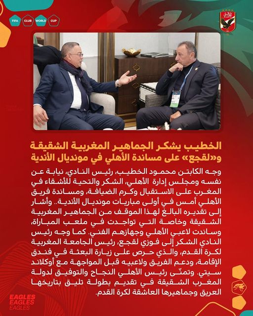 تقدم الكابتن محمود الخطيب، رئيس النادي الأهلي، ورئيس بعثة الفريق الأول لكرة القدم في المغرب، برسالة شكر الي الجماهير المغربية، علي مساندة الأهلي في كأس العالم للأندية.