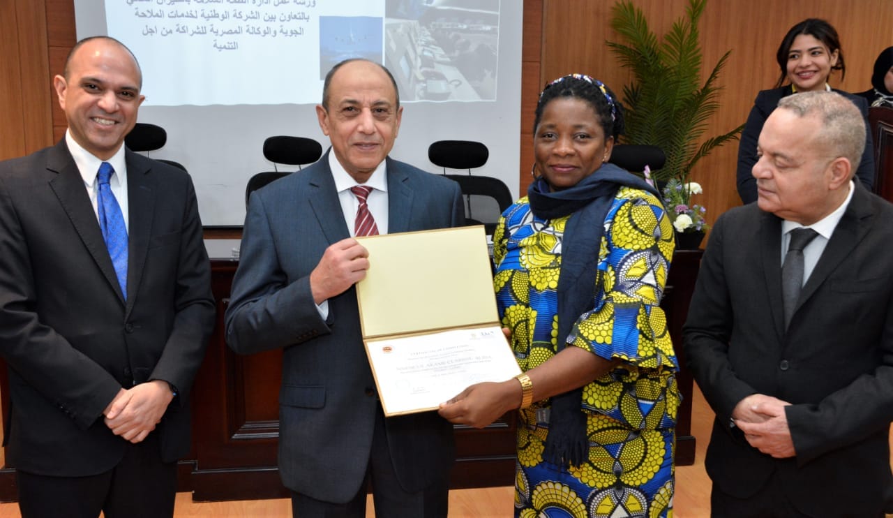 وقد قام وزير الطيران المدني بتسليم شهادات تأهيل المتدربين من الدول الإفريقية بحضور السفير حسن النشار نائب رئيس الوكالة المصرية للشراكة من أجل التنمية والمهندس محمد سعيد محروس رئيس الشركة القابضة للمطارات والملاحة الجوية والكابتن إيهاب محيي الدين رئيس الشركة الوطنية لخدمات الملاحة.