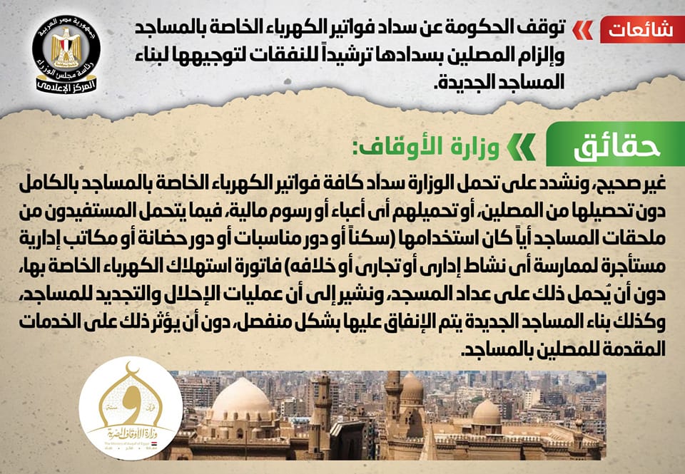 انتشر في بعض المواقع الإلكترونية وصفحات التواصل الاجتماعي أنباء بشأن توقف الحكومة عن سداد فواتير الكهرباء الخاصة بالمساجد وإلزام المصلين بسدادها ترشيداً للنفقات لتوجيهها لبناء المساجد الجديدة.