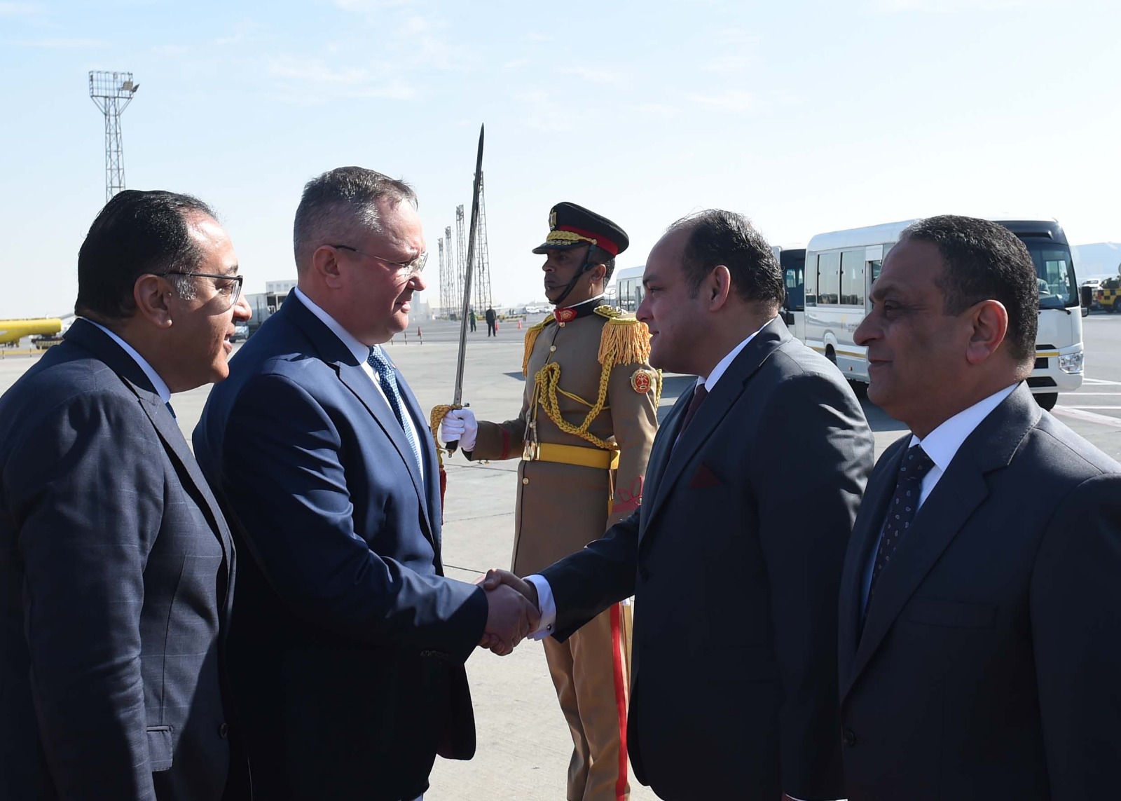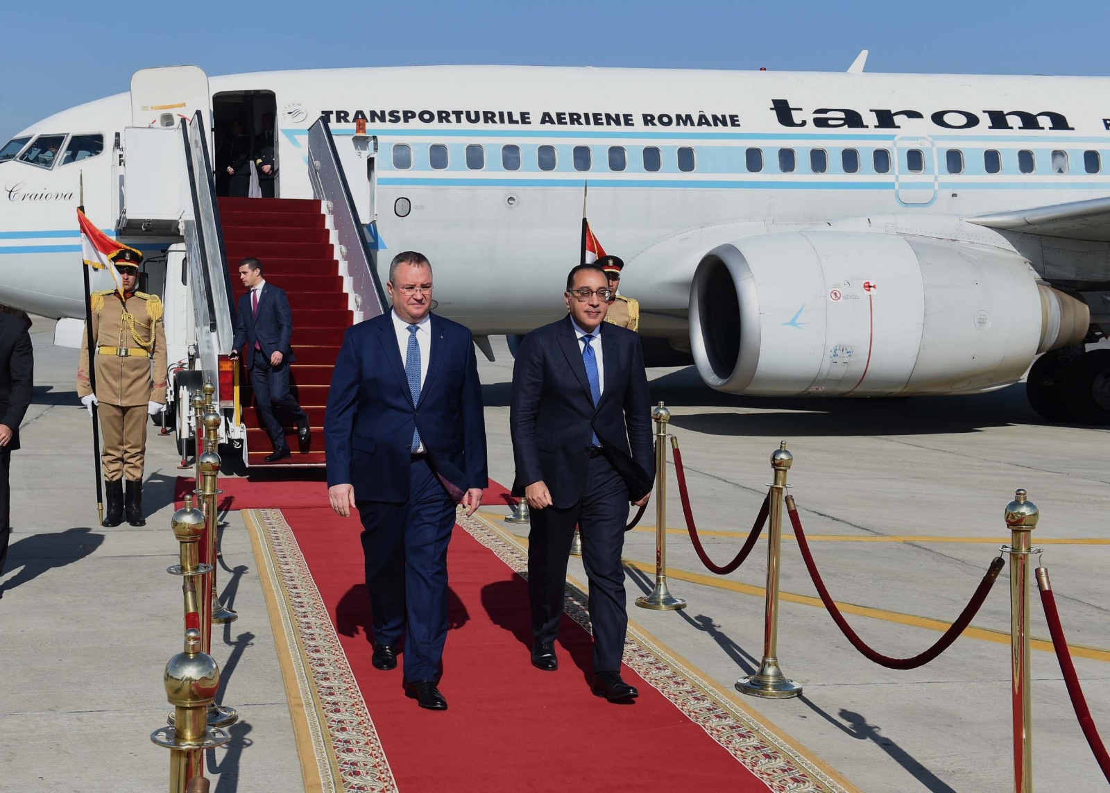 استقبل الدكتور مصطفى مدبولي، رئيس الوزراء، صباح اليوم بمطار القاهرة الدولي، نيكولاي تشوكا، رئيس وزراء جمهورية رومانيا، الذي وصل في زيارة رسمية لمصر تستغرق يومين، على رأس وفد رفيع المستوى يضم عددا من الوزراء والمسئولين الحكوميين.