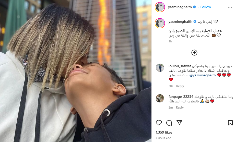 ونشر ياسمين غيث عبر صفحتها على موقع تبادل الصور والفيديوهات "إنستجرام" صورة مع إبنها وعلقت عليها: "ابني يا رب.. هعمل العملية يوم الإتنين الصبح بإذن الله، خايفة بس واثقة في ربي".