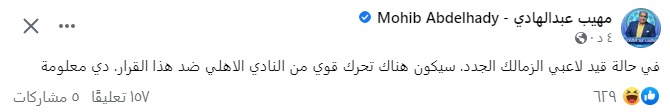 وعلق مهيب خلال منشور عبر صفحته الرسمية علي موقع التواصل الإجتماعي فيسبوك وكتب : "في حالة قيد لاعبي الزمالك الجدد، سيكون هناك تحرك قوي من النادي الأهلي ضد هذا القرار، دي معلومة".