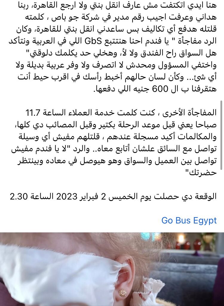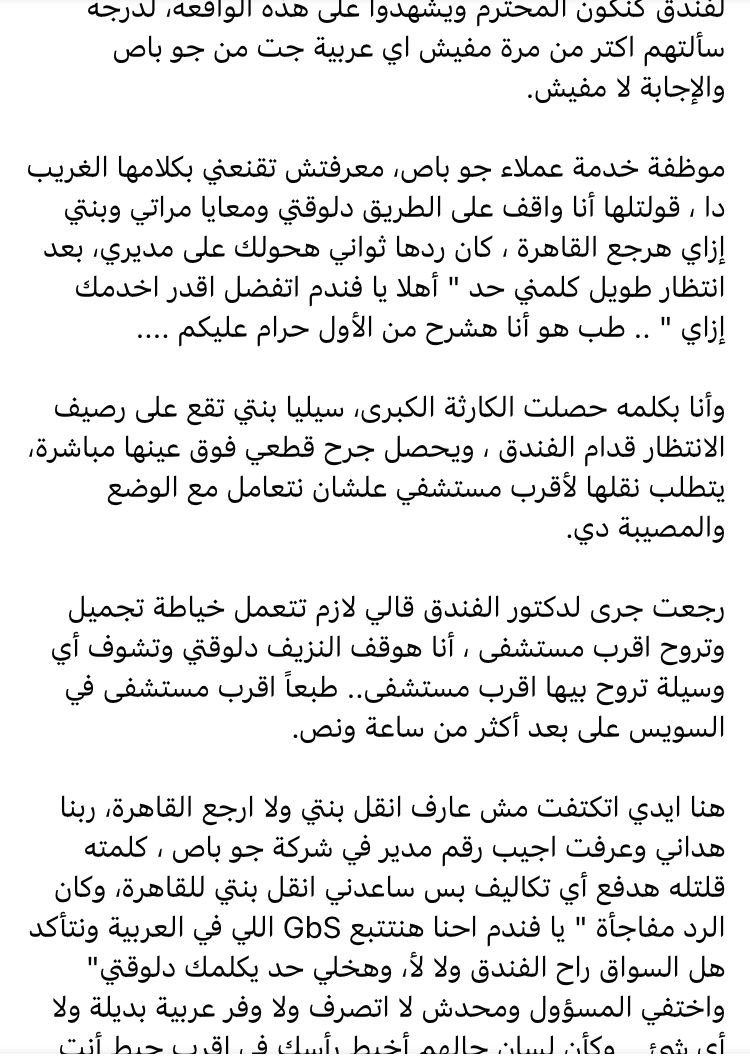 وقال " وأنا بكلمه حصلت الكارثة الكبرى، سيليا بنتي تقع على رصيف الانتظار قدام الفندق ، ويحصل جرح قطعي فوق عينها مباشرة، يتطلب نقلها لأقرب مستشفي علشان نتعامل مع الوضع والمصيبة دي.. رجعت جرى لدكتور الفندق قالي لازم تتعمل خياطة تجميل وتروح اقرب مستشفى ، أنا هوقف النزيف دلوقتي وتشوف أي وسيلة تروح بيها اقرب مستشفى.. طبعاً اقرب مستشفى في السويس على بعد أكثر من ساعة ونص.. هنا ايدي اتكتفت مش عارف انقل بنتي ولا ارجع القاهرة، ربنا هداني وعرفت اجيب رقم مدير في شركة جو باص ، كلمته قلتله هدفع أي تكاليف بس ساعدني انقل بنتي للقاهرة، وكان الرد مفاجأة " يا فندم احنا هنتتبع GbS اللي في العربية ونتأكد هل السواق راح الفندق ولا لأ، وهخلي حد يكلمك دلوقتي" واختفي المسؤول ومحدش لا اتصرف ولا وفر عربية بديلة ولا أي شئ... وكأن لسان حالهم أخبط رأسك في اقرب حيط أنت هتقرفنا ب ال 600 جنيه اللي دفعها.