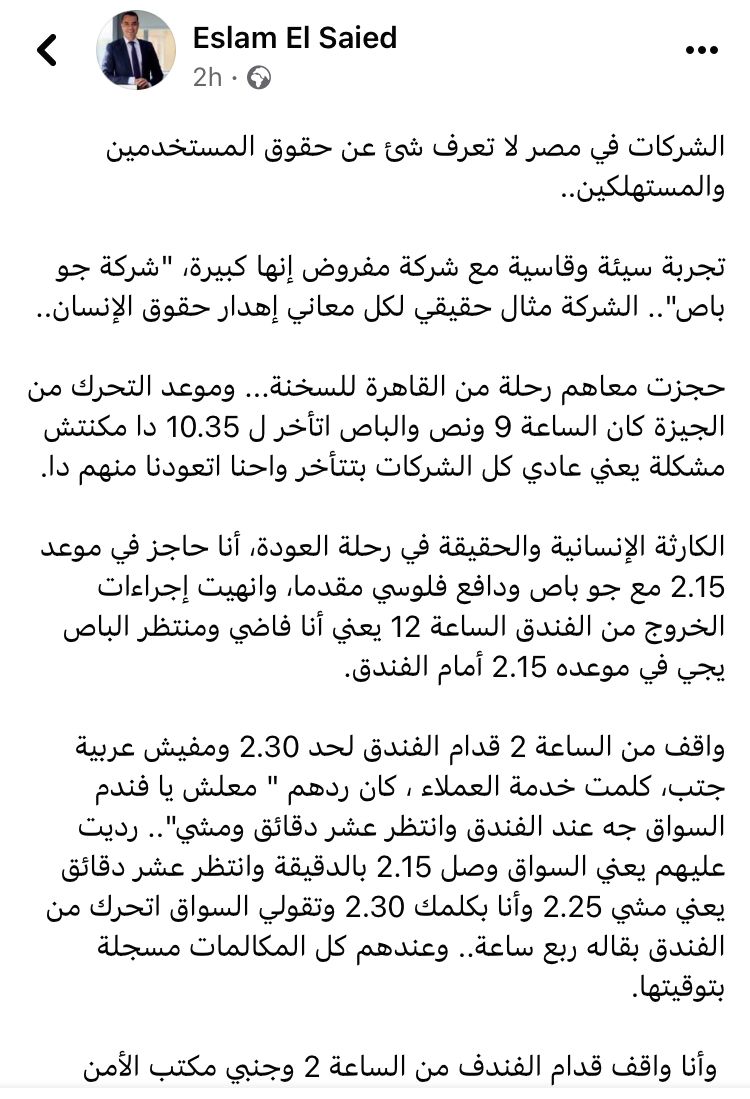 وقال الزميل إسلام سعيد ، صاحب الواقعة ،"الشركات في مصر لا تعرف شئ عن حقوق المستخدمين والمستهلكين..تجربة سيئة وقاسية مع شركة مفروض إنها كبيرة، "شركة جو باص".. الشركة مثال حقيقي لكل معاني إهدار حقوق الإنسان..حجزت معاهم رحلة من القاهرة للسخنة... وموعد التحرك من الجيزة كان الساعة 9 ونص والباص اتأخر ل 10.35 دا مكنتش مشكلة يعني عادي كل الشركات بتتأخر واحنا اتعودنا منهم دا.. الكارثة الإنسانية والحقيقة في رحلة العودة، أنا حاجز في موعد 2.15 مع جو باص ودافع فلوسي مقدما، وانهيت إجراءات الخروج من الفندق الساعة 12 يعني أنا فاضي ومنتظر الباص يجي في موعده 2.15 أمام الفندق.