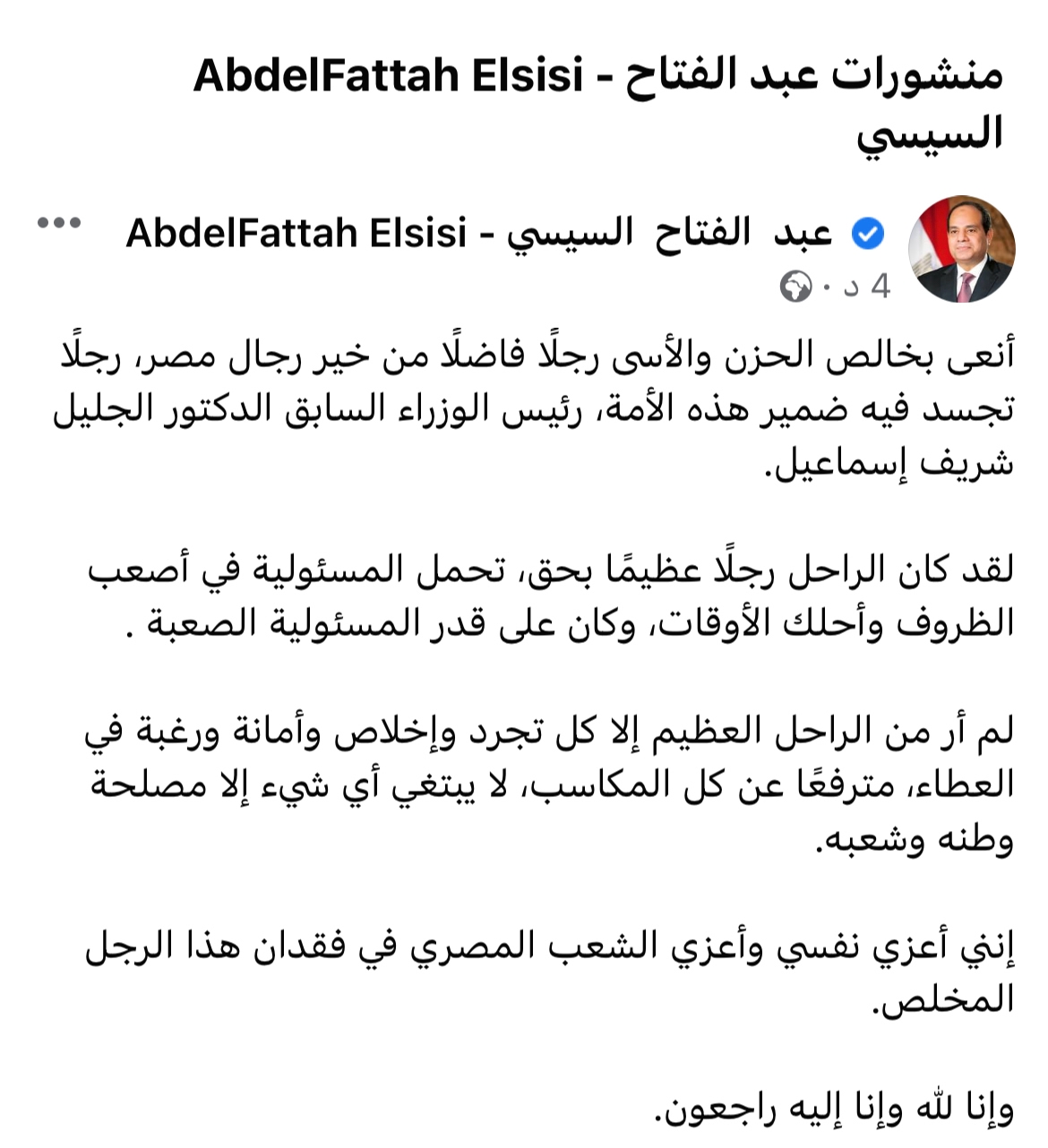 وقال الرئيس عبدالفتاح السيسي، انعي بخالص الحزن والأسى رجلًا فاضلًا من خير رجال مصر، رجلًا تجسد فيه ضمير هذه الأمة، رئيس الوزراء السابق الدكتور الجليل شريف إسماعيل.