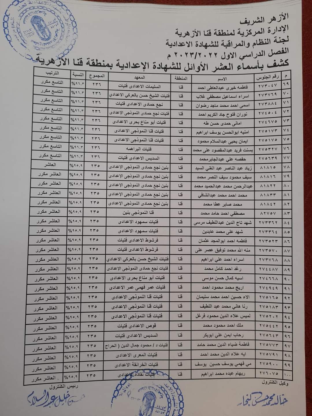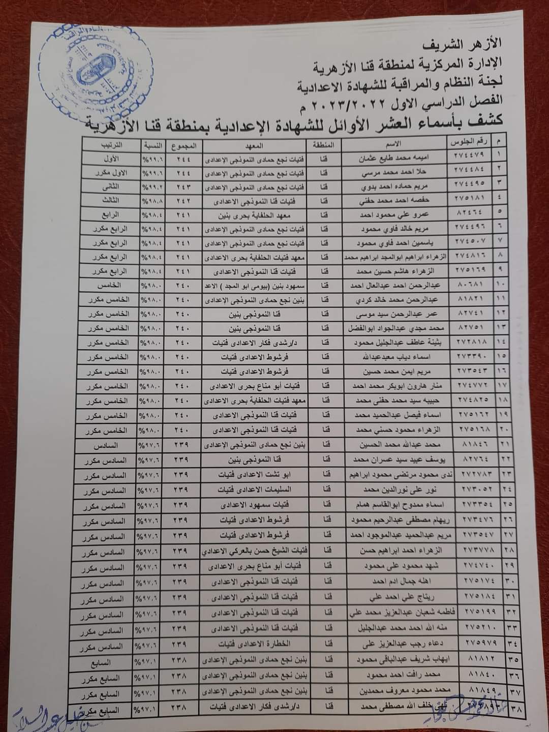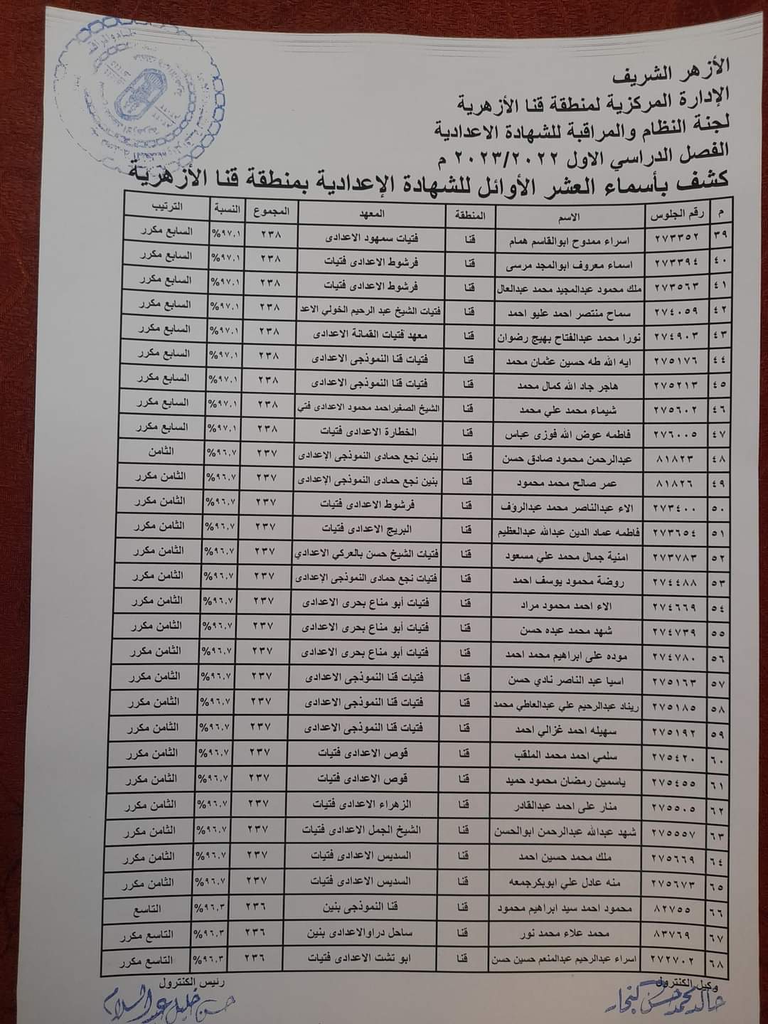 أعلنت منطقة قنا الأزهرية، أسماء العشرة الأوائل في امتحانات الشهادة الإعدادية الأزهرية، في الفصل الدراسي الأول.