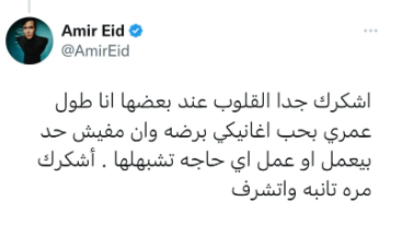 ورد أمير عيد عليها قائلا:" اشكرك جدا القلوب عند بعضها انا طول عمري بحب اغانيكي برضه وان مفيش حد بيعمل أو عمل اي حاجه تشبهلها. أشكرك مره تانبه واتشرف.