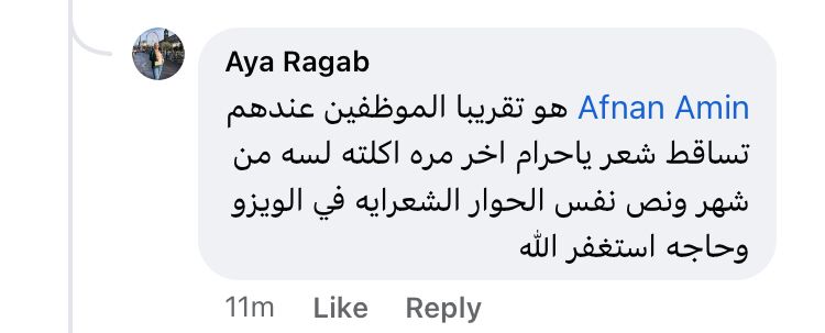 وقالت أخري،" هو تقريبا الموظفين عندهم تساقط شعر ياحرام اخر مره اكلته لسه من شهر ونص نفس الحوار الشعرايه في الويزو وحاجه استغفر الله.