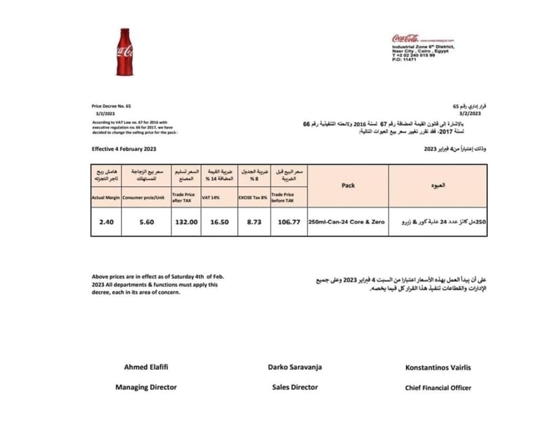 ورفعت شركة بيبسي كولا، أسعار كانز كوكاكولا زيرو، لتسجل العبوة الواحدة نحو 6.75 جنيه، وبلغ سعر اللفة التي تحمل 24 عبوة نحو 153 جنيهًا في أرض المصنع.