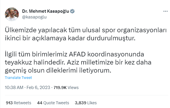 ونشر أوغلو تغريده عبر حسابه الرسمي على موقع التواصل الاجتماعي "تويتر" قائلاص : "تم تعليق جميع المنظمات الرياضية الوطنية التي ستقام في بلدنا حتى إشعار آخر"