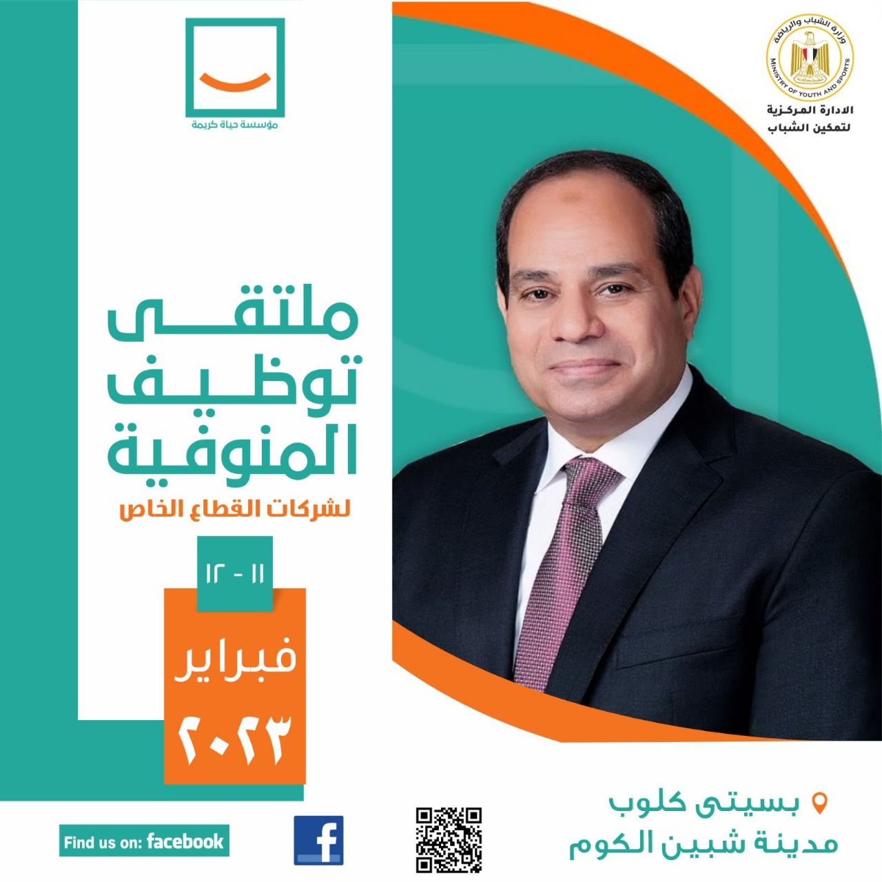 في إطار مبادرة الرئيس عبد الفتاح السيسي، "حياة كريمة"، تطلق وزارة الشباب والرياضة ممثلةً في الإدارة المركزية لتمكين الشباب بالتعاون مؤسسة حياة كريمة ملتقى توظيف بنادي سيتي كلوب بالمنوفية لشركات القطاع الخاص يومي 11 و12 فبراير 2023 من الساعة 10 ص إلى 3 م، للشباب الباحثين عن وظائف بشركات القطاع الخاص وفى كافة المجالات المختلفة لأبناء إقليم الدلتا.