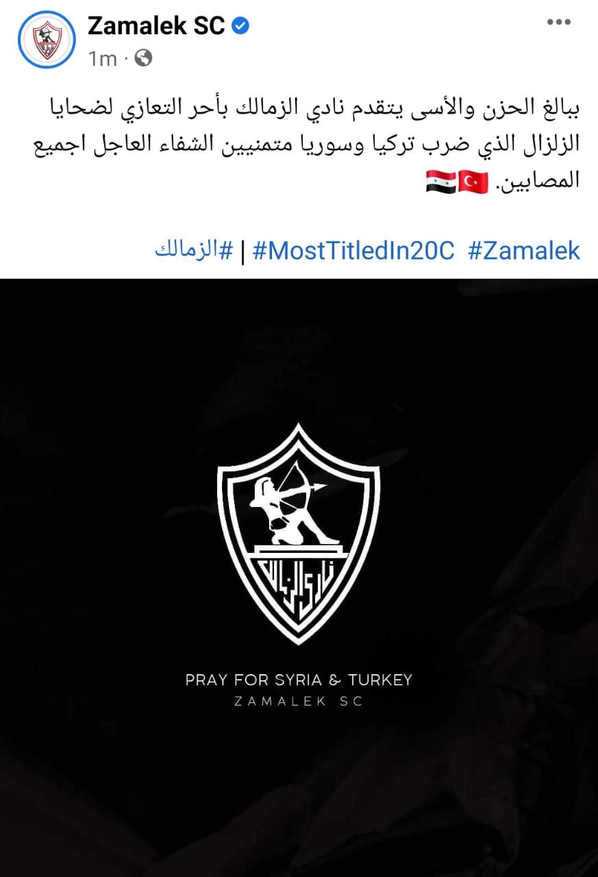 ونشر الزمالك عبر الحساب الرسمي بموقع التواصل الاجتماعي "فيسبوك": "ببالغ الحزن والأسى يتقدم نادي الزمالك بأحر التعازي لضحايا الزلزال الذي ضرب تركيا وسوريا متمنيين الشفاء العاجل اجميع المصابين".