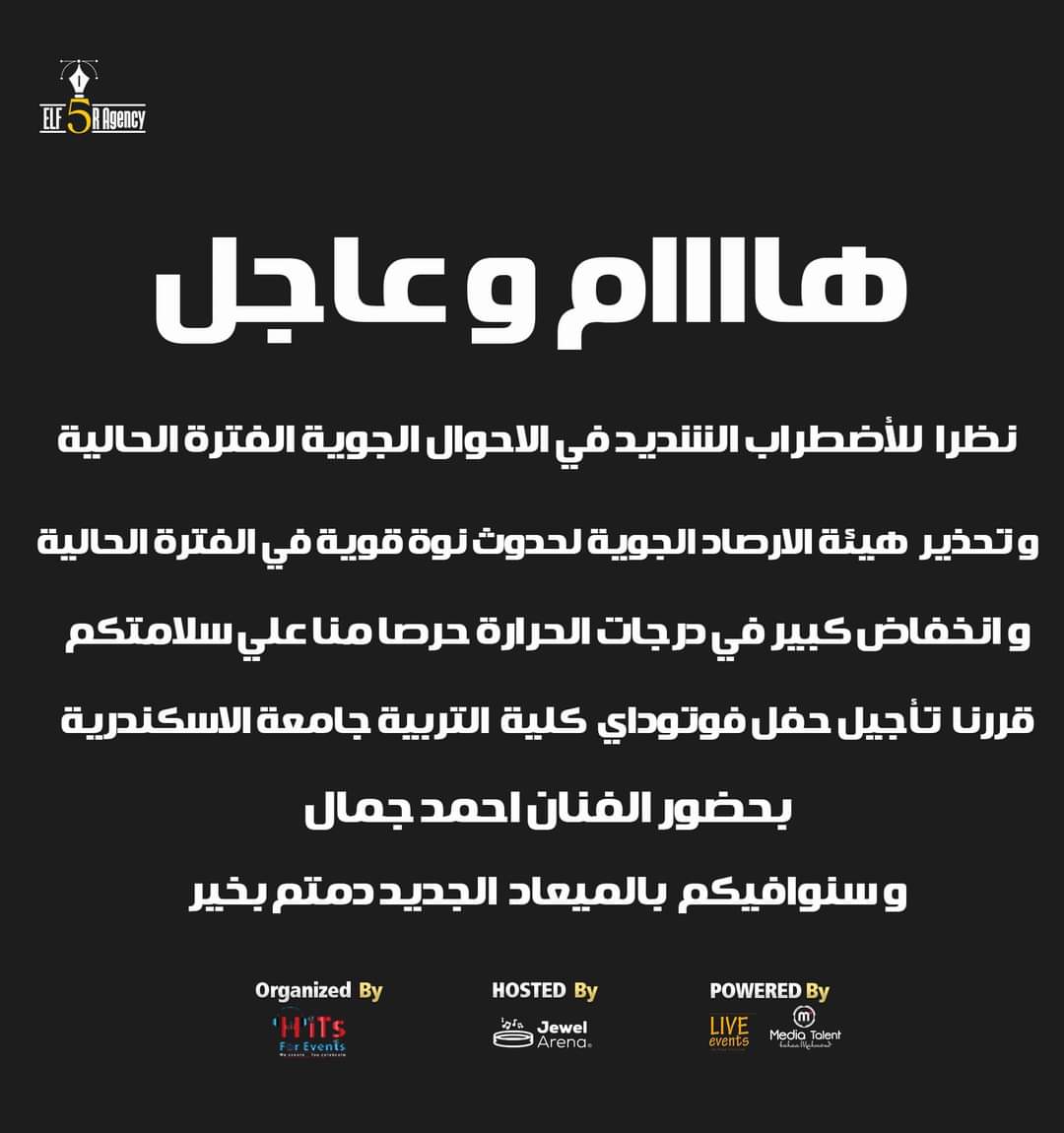 ونشر أحمد جمال عبر خاصية القصص المصورة قائلًا:" نظرًا للظروف الجوية القاسية وتداعيات الزلزال وحرصًا على سلامة الطلاب الخريجين.. تم تأجيل الحفل لمدعد آخر سيتم الإعلان عنه قريبًا".