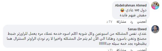 وعلق آخر على مشكلة السيدة وقال "عندي نفس المشكله من اسبوعين وكل شويه اكلم اسوء خدمه عملاء مره يعمل للراورتر ضبط مصنع ونغي باسورد وهكذا الي الآن لم يتم حل المشكله واخيرا لا زم نودي الراوتر السنترال هما يظبطوه بجد خدمه سيئه جداااااااا