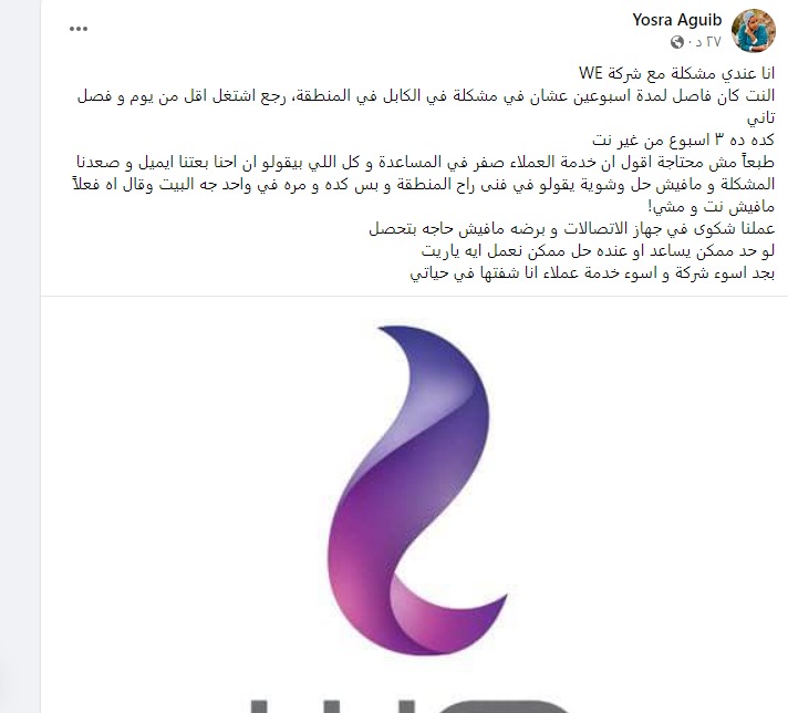 وتابعت عن مشكلتها مع شركة we ، "مافيش حل وشوية يقولو في فنى راح المنطقة و بس كده و مره في واحد جه البيت وقال اه فعلاً مافيش نت و مشي! عملنا شكوى في جهاز الاتصالات و برضه مافيش حاجه بتحصل لو حد ممكن يساعد او عنده حل ممكن نعمل ايه ياريت بجد اسوء شركة و اسوء خدمة عملاء انا شفتها في حياتي"