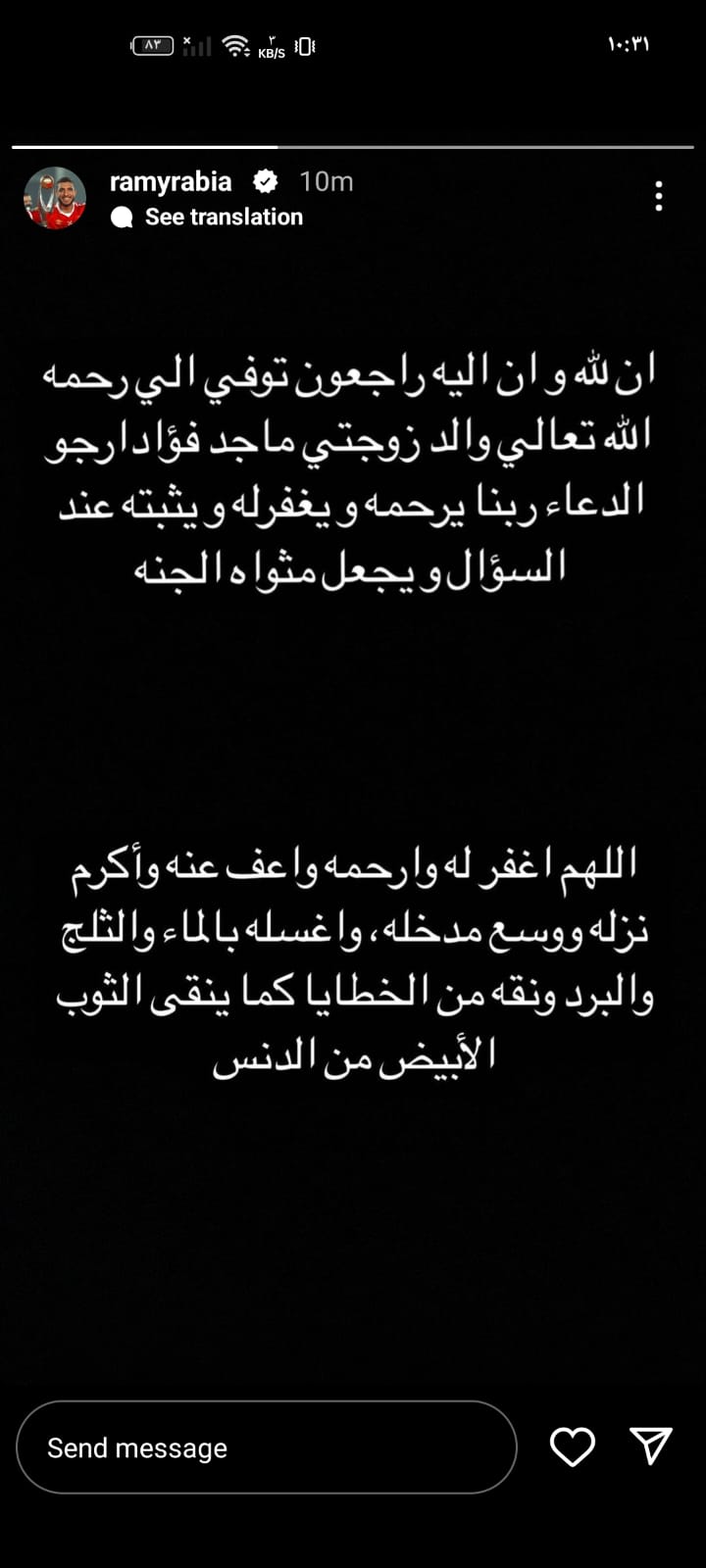أعلن رامي ربيعه ، لاعب الفريق الأول لكرة القدم بالنادي الأهلي ، عن وفاة والد زوجته صباح اليوم الأربعاء ، قبل اللقاء المرتقب بين الأهلي وفريق ريال مدريد الإسباني ، ضمن منافسات الدور نصف النهائي، من بطولة كأس العالم للأندية.