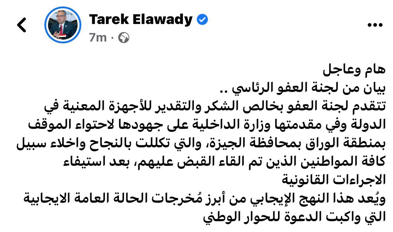 تقدمت لجنة العفو الرئاسي بخالص الشكر والتقدير للأجهزة المعنية في الدولة وفي مقدمتها وزارة الداخلية على جهودها لاحتواء الموقف بمنطقة الوراق بمحافظة الجيزة، والتي تكللت بالنجاح وإخلاء سبيل جميع المواطنين الذين تم إلقاء القبض عليهم، بعد استيفاء الإجراءات القانونية.