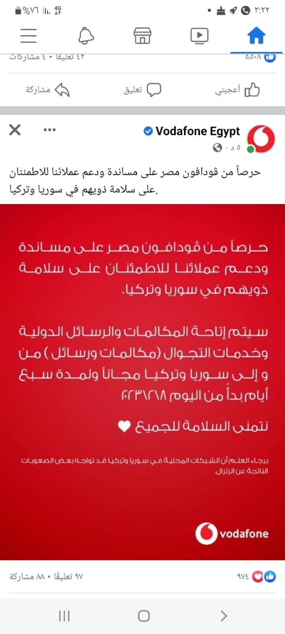 وقالت شركة "فوادفون مصر" في بيانها اليوم، "حرصاً من فودافون مصر على دعم ومساندة عملائنا للأطمئنان على سلامة ذويهم في سوريا وتركيا، ستم إتاحة المكالمات والرسائل الدولية وخدمات التجوال (مكالمات ورسائل) من وإلى سوريا مجاناً ولمدة 7 أيام، بداية من اليوم الموافق الثامن من فبراير".