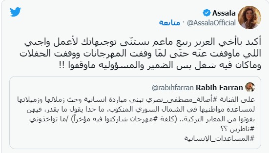 وكتب ربيع فران عبر حسابه في "تويتر"، "على الفنانة أصالة_مصطفى_نصري تبني مبادرة إنسانية وحث زملائها وزميلاتها لمساعدة مواطنيها في الشمال السوري المنكوب".