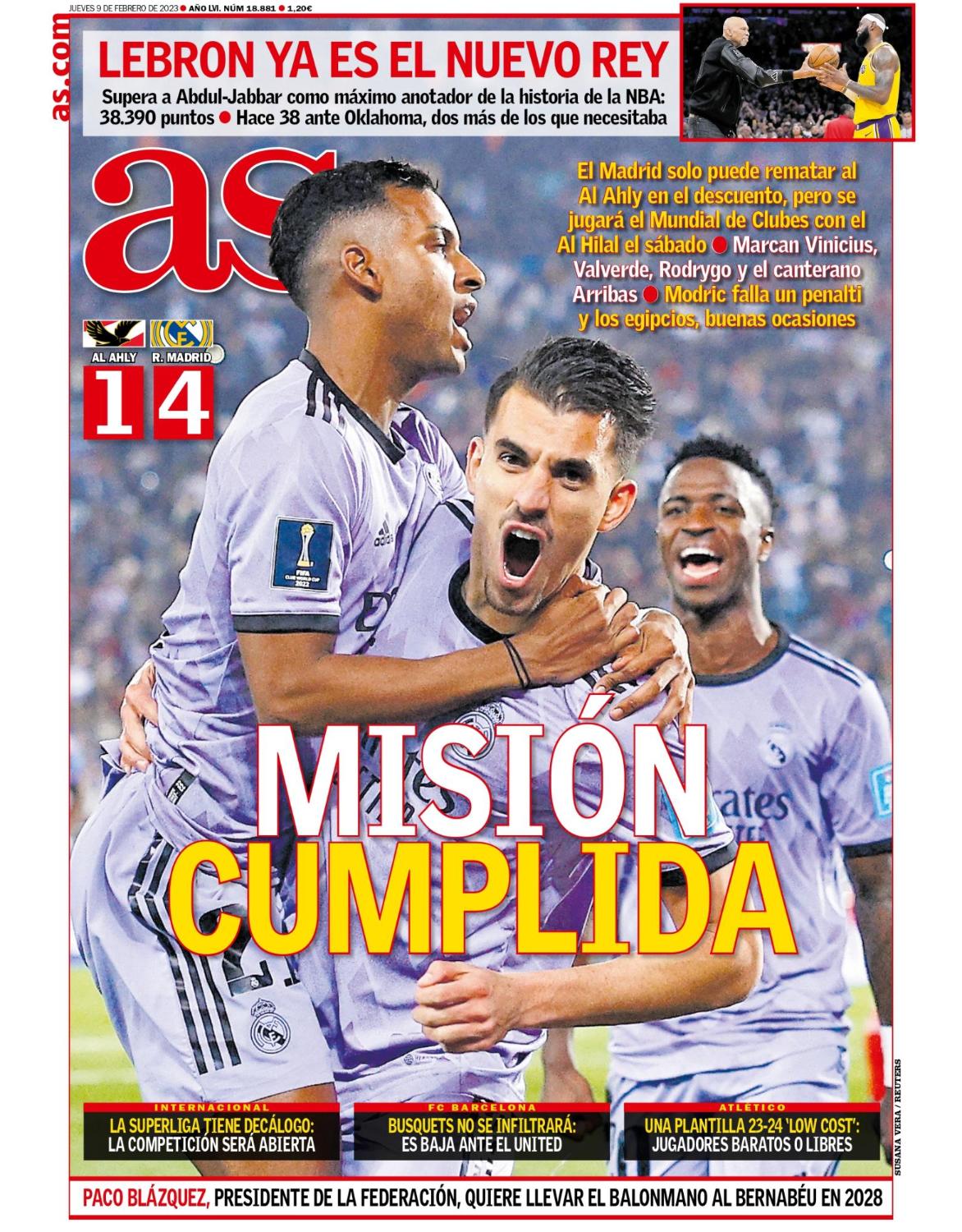 في حين عنونت صحيفة "أس"، "تمت المهمة.. ريال مدريد ينهى أحلام الأهلي، سيلعب الفريق الأبيض نهائي كأس العالم للأندية مع الهلال يوم السبت، ريال مدريد بقيادة فينيسيوس وفالفيردي ورودريجو ولاعب فريق الشباب أريباس يسجلون ضد المصريين، ومودريتش يّهدر ركلة جزاء".