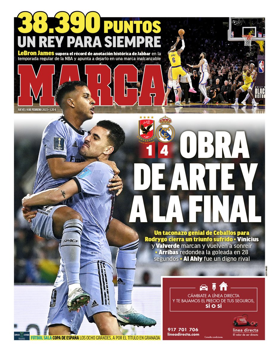 وعنونت صحيفة "ماركا"، "عمل فني رائع.. سيبايوس يمرر بالكعب لرودريغو الذي يختتم انتصاراً رائعاً ولكن بمعاناةـ فينيسيوس وفالفيردي يسجلوا مجدداً ويبتسمان مرة أخرى، أريباس يختتم الفوز بعد 28 ثانية فقط من دخوله بديلاً، إحترام كبير للنادي الأهلي الذي قدم مباراة جيدة".