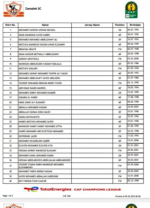 أعلن الاتحاد الأفريقي لكرة القدم "كاف" ، عن قائمة فريق الزمالك الرسمية، قبل منافسات دور المجموعات بمسابقة دوري أبطال أفريقيا.