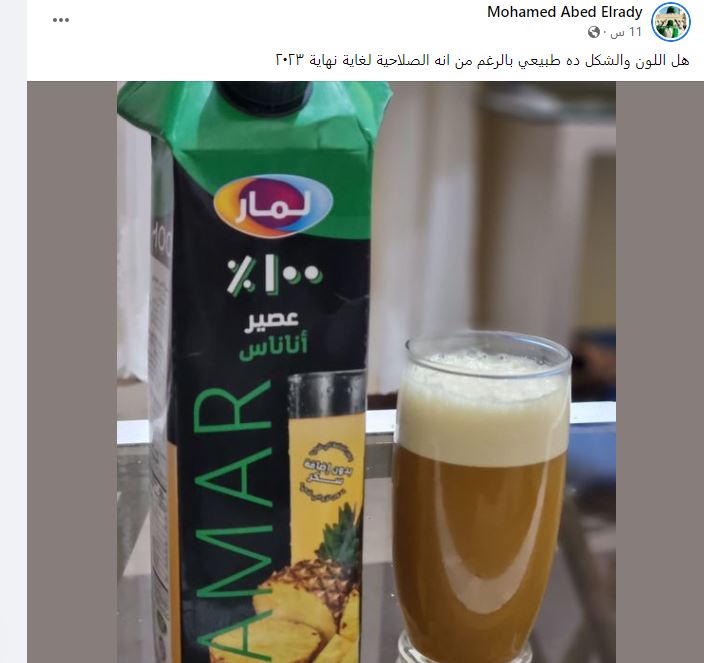 حذر مواطن من منتجات شركة لمار بعد شرائه منتج عصير أناناس ليجد شكله غريب، وقال صاحب الشكوي ،" هل اللون والشكل ده طبيعي بالرغم من انه الصلاحية لغاية نهاية 2023".