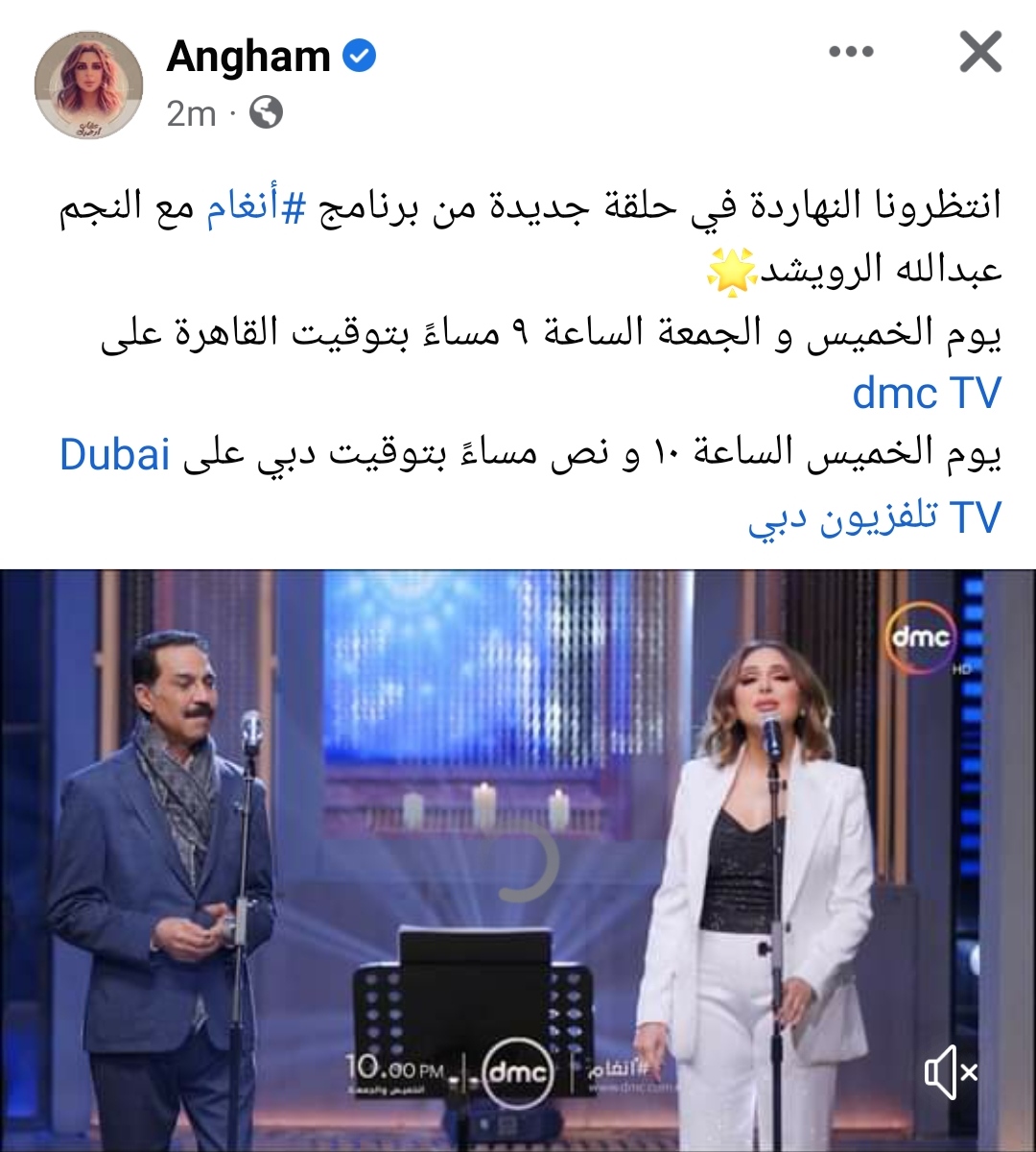 نشرت أنغام عبر صفحتها على موقع التواصل الإجتماعي "الفيسبوك" قائلا: "انتظرونا النهاردة في حلقة جديدة من برنامج أنغام مع النجم عبدالله الرويشد يوم الخميس والجمعة الساعة ٩ مساءً بتوقيت القاهرة على dmc TV يوم الخميس الساعة 10 ونص مساءً بتوقيت دبي على Dubai TV تلفزيون دبي".