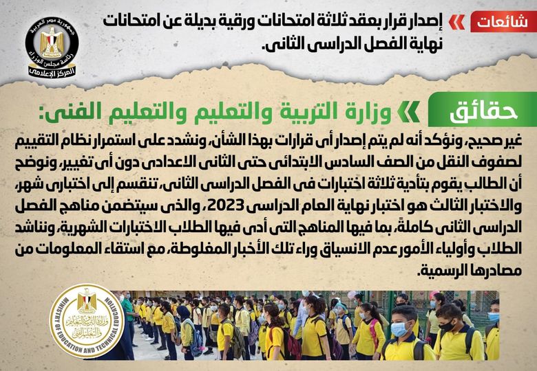 وقام المركز الإعلامي لمجلس الوزراء بالتواصل مع وزارة التربية والتعليم والتعليم الفني، والتي نفت تلك الأنباء، مُؤكدةً أنه لا صحة لإصدار قرار بعقد ثلاثة امتحانات ورقية بديلة عن امتحانات نهاية الفصل الدراسي الثاني، وأنه لم يتم إصدار أي قرارات بهذا الشأن، مُشددةً على استمرار نظام التقييم لصفوف النقل من الصف السادس الابتدائي حتى الثاني الإعدادي دون أي تغيير، مُوضحةً أن الطالب يقوم بتأدية ثلاثة اختبارات في الفصل الدراسي الثاني، تنقسم إلى اختباري شهر، والاختبار الثالث هو اختبار نهاية العام الدراسي 2023، والذي سيتضمن مناهج الفصل الدراسي الثاني كاملةً، بما فيها المناهج التي أدى فيها الطلاب الاختبارات الشهرية، مُناشدةً الطلاب وأولياء الأمور عدم الانسياق وراء تلك الأخبار المغلوطة، مع استقاء المعلومات من مصادرها الرسمية.