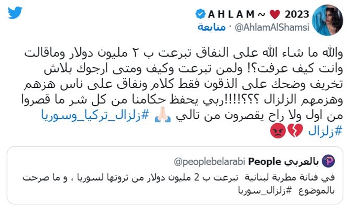 وهاجمت أحلام مروجي شائعة تبرع إحدى الفنانات بمبلغ مليوني دولار أمريكي لإغاثة منكوبي ضحايا الزلزال عبر حسابها على “تويتر” قائلة: "والله ما شاء الله على النفاق تبرعت بـ 2 مليون دولار وما قالت وإنت كيف عرفت؟! ولمن تبرعت وكيف ومتى؟".