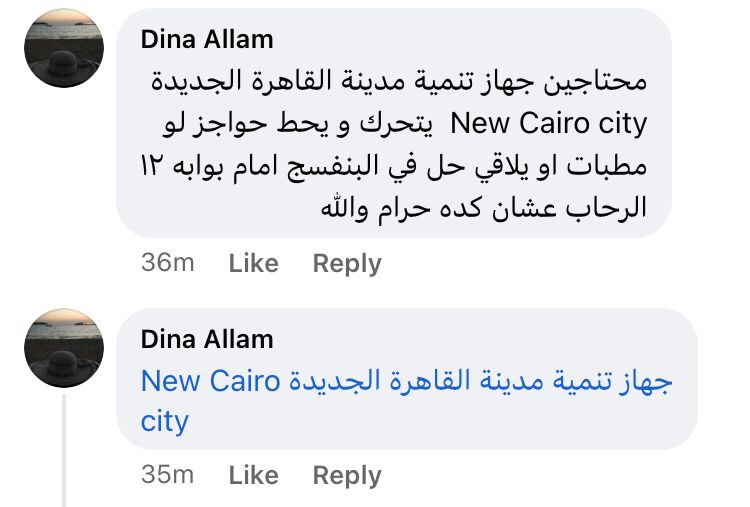 ونشرت صاحبة الاستغاثة صور لعدد من الحوادث التي تكررت قائلة ،"محتاجين جهاز تنمية مدينة القاهرة الجديدة New Cairo city يتحرك و يحط حواجز لو مطبات او يلاقي حل في البنفسج امام بوابه 12 الرحاب عشان كده حرام والله".
