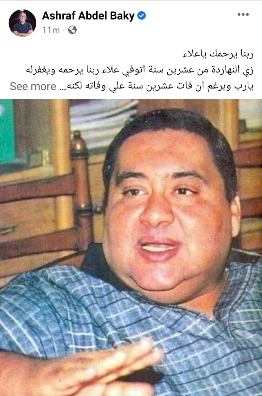كتب أشرف عبد الباقي عبر صفحته على موقع التواصل الإجتماعي “الفيسبوك” قائلا: “ربنا يرحمك ياعلاء زي النهاردة من عشرين سنة اتوفي علاء ربنا يرحمه ويغفرله يارب وبرغم ان فات عشرين سنة علي وفاته لكنه كان ومازال اقرب صديق ليا”.