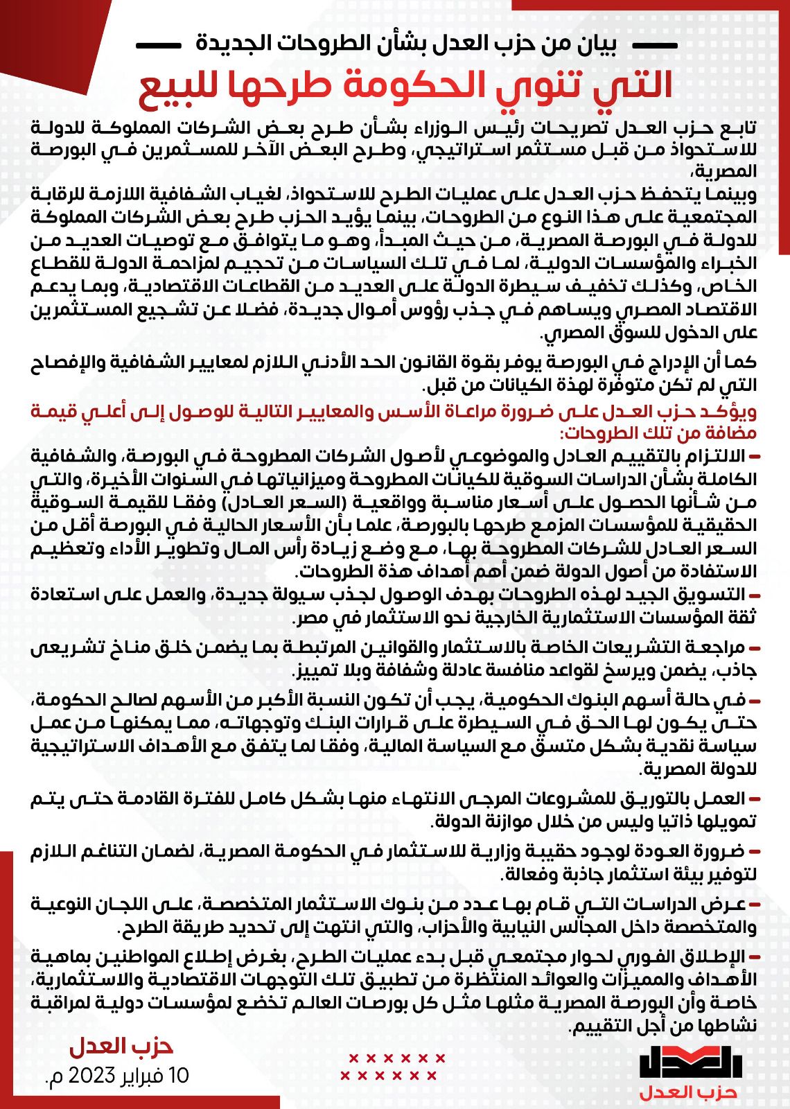 تابع حزب العدل تصريحات الدكتور مصطفى مدبولي رئيس الوزراء بشأن طرح بعض الشركات المملوكة للدولة للاستحواذ من قبل مستثمر استراتيجي، وطرح البعض الآخر للمستثمرين في البورصة المصرية.