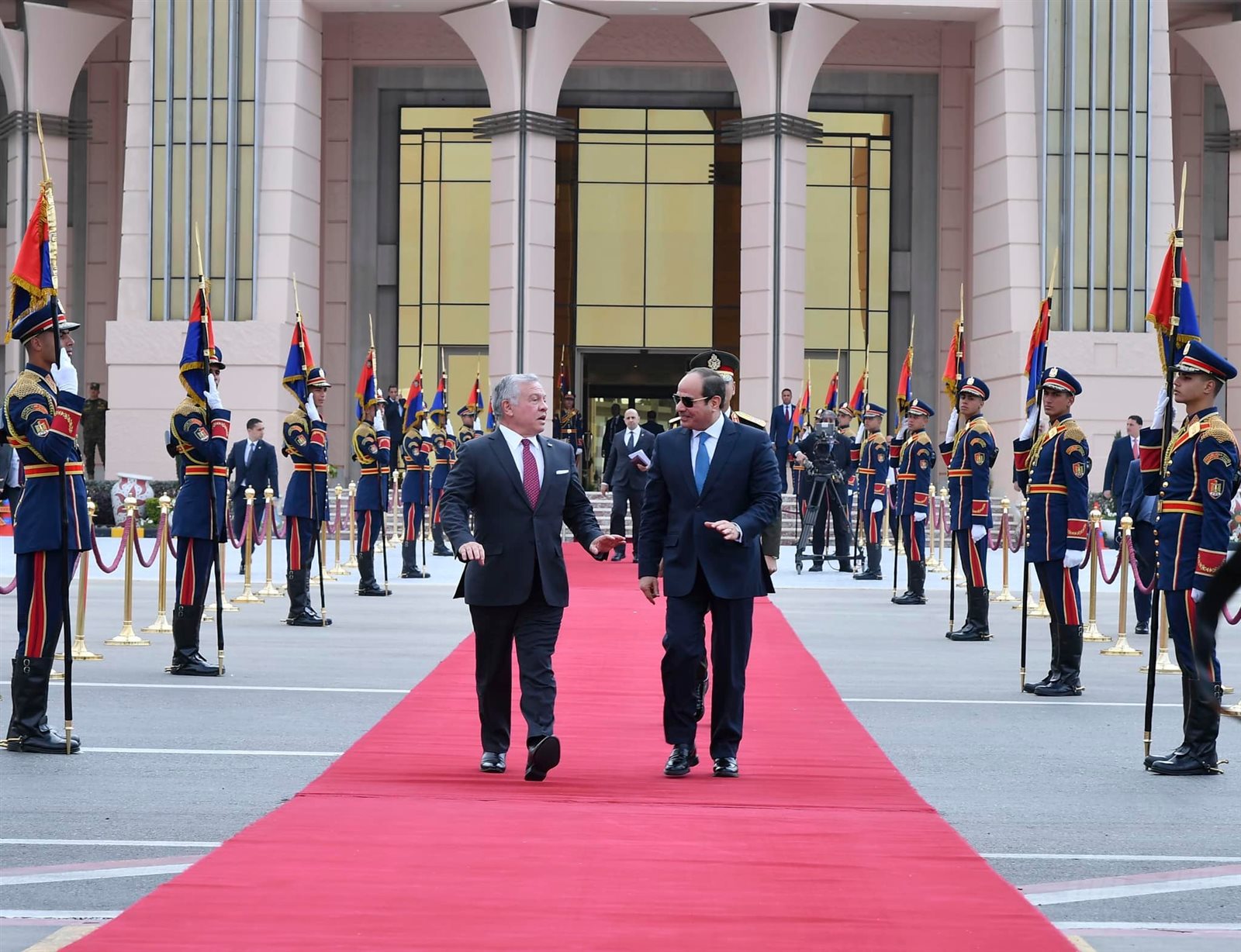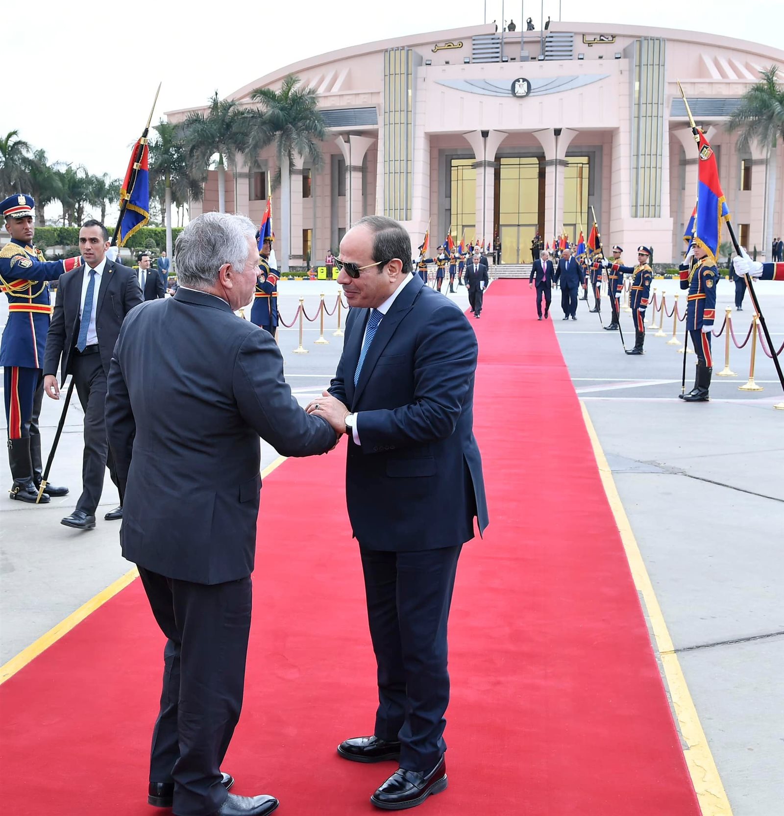 ودع الرئيس عبد الفتاح السيسي، الملك عبد الله الثاني بن الحسين، ملك المملكة الأردنية الهاشمية، في مطار القاهرة، وذلك بعد المشاركة في مؤتمر القدس "صمود وتنمية"، المنعقد اليوم بمقر جامعة الدول العربية بالقاهرة.