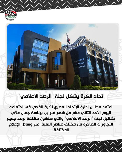 اعتمد مجلس إدارة الاتحاد المصري لكرة القدم، في اجتماعه اليوم الأحد الثاني عشر من شهر فبراير، برئاسة جمال علام، تشكيل لجنة "الرصد الإعلامي" والتي ستكون مكلفة لرصد جميع التجاوزات الصادرة من مختلف عناصر اللعبة، عبر وسائل الإعلام المختلفة.