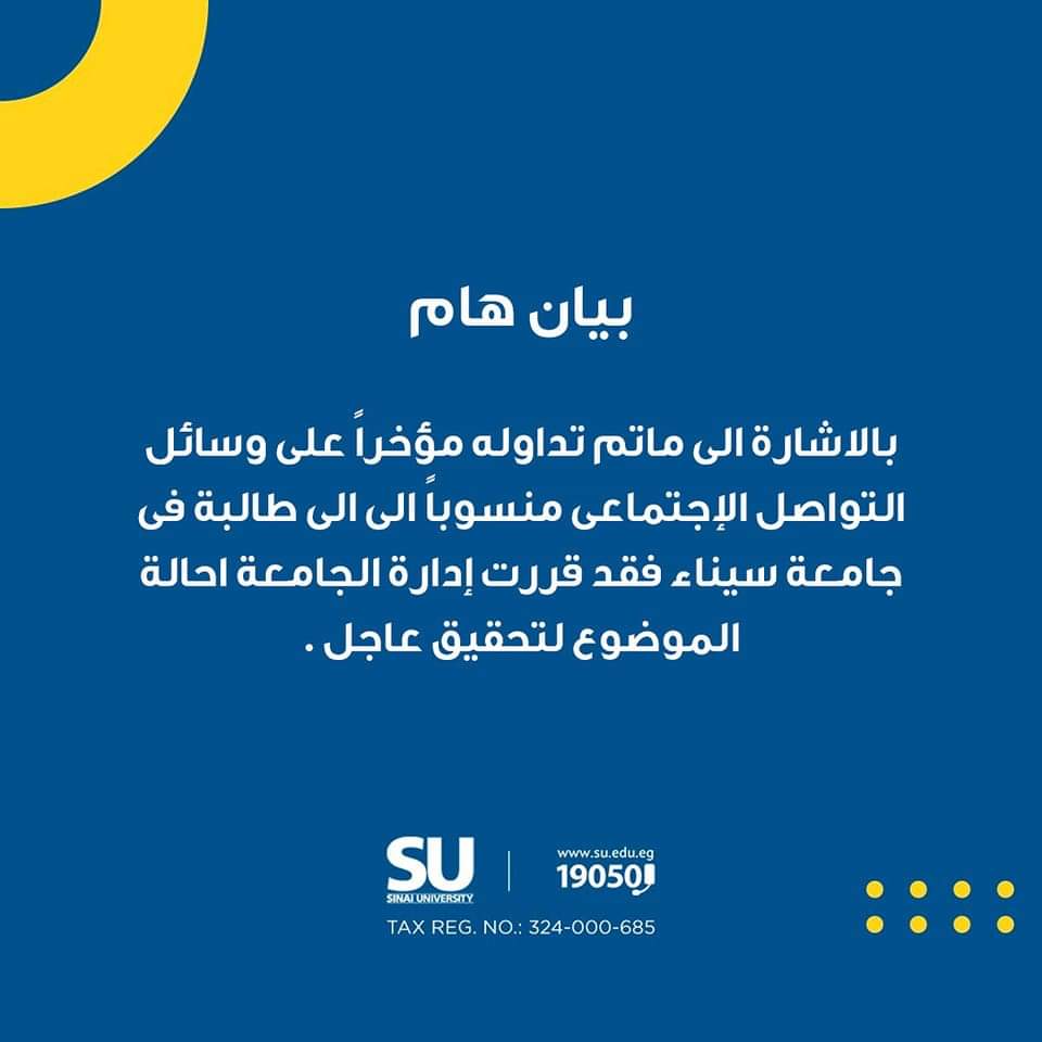 وذكرت جامعة سيناء، في بيان لها، أنه بالإشارة إلى ما تم تداوله مؤخرا على وسائل التواصل الاجتماعي منسوبا إلى طالبة في جامعة سيناء فقد قررت إدارة الجامعة إحالة الموضوع لتحقيق عاجل.