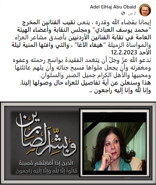 وقالت النقابة فى البيان :"إيمانًا بقضاء الله وقدره، ينعى نقيب الفنانين المخرج محمد يوسف العبادي، مجلس النقابة وأعضاء الهيئة العامة في نقابة الفنانين الأردنيين بأصدق مشاعر العزاء والمواساة الزميلة هيفاء الآغا، التي وافتها المنية ليلة الأحد".