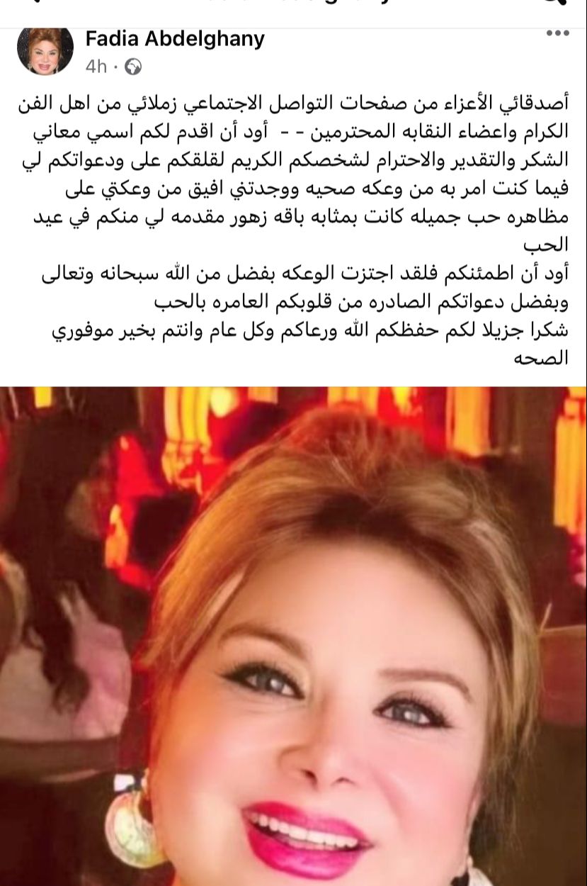 وكتبت فادية عبد الغنى عبر حسابها الرسمي بفيس بوك :" أصدقائي الأعزاء من صفحات التواصل الاجتماعي زملائي من أهل الفن الكرام وأعضاء النقابه المحترمين أود أن أقدم لكم أسمى معاني الشكر والتقدير والاحترام لشخصكم الكريم لقلقكم على ودعواتكم لي فيما كنت أمر به من وعكة صحية".